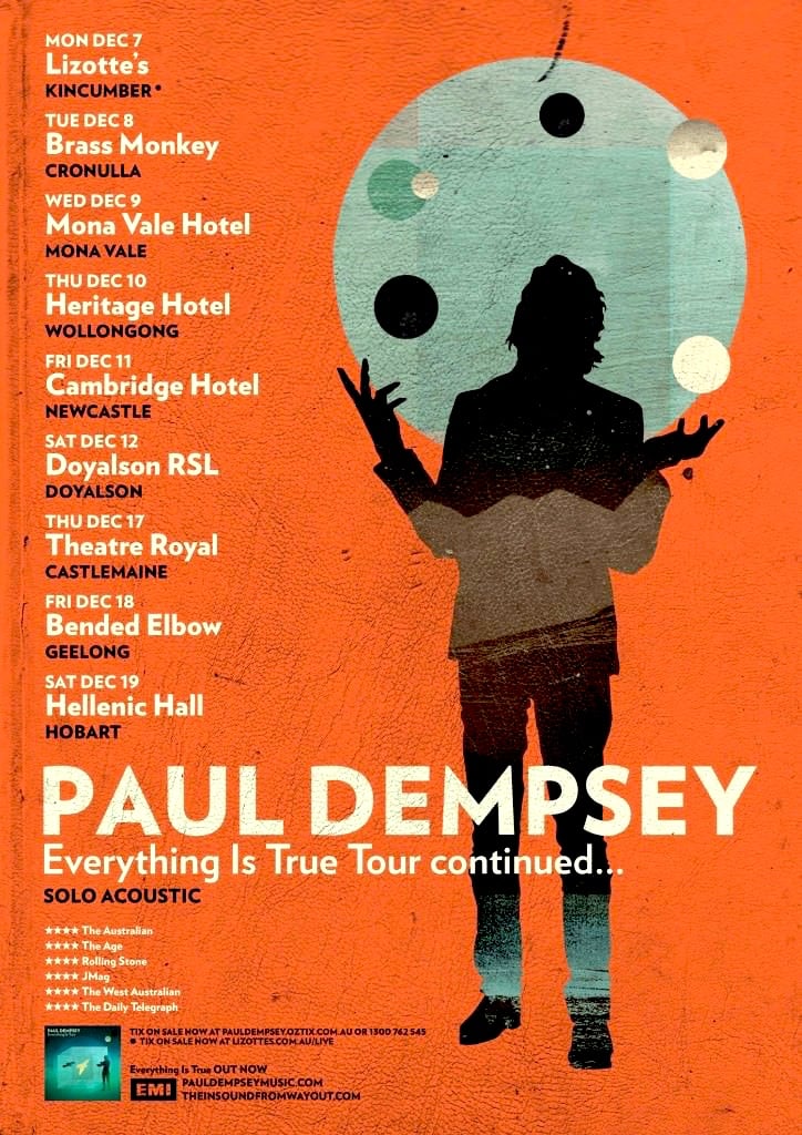 As we go through the archives at Paul Dempsey/ Something for Kate HQ, we are discovering some rare gems! We have a very limited number of this never before available A3 Tour poster for Paul's solo regional tour of December 2009.